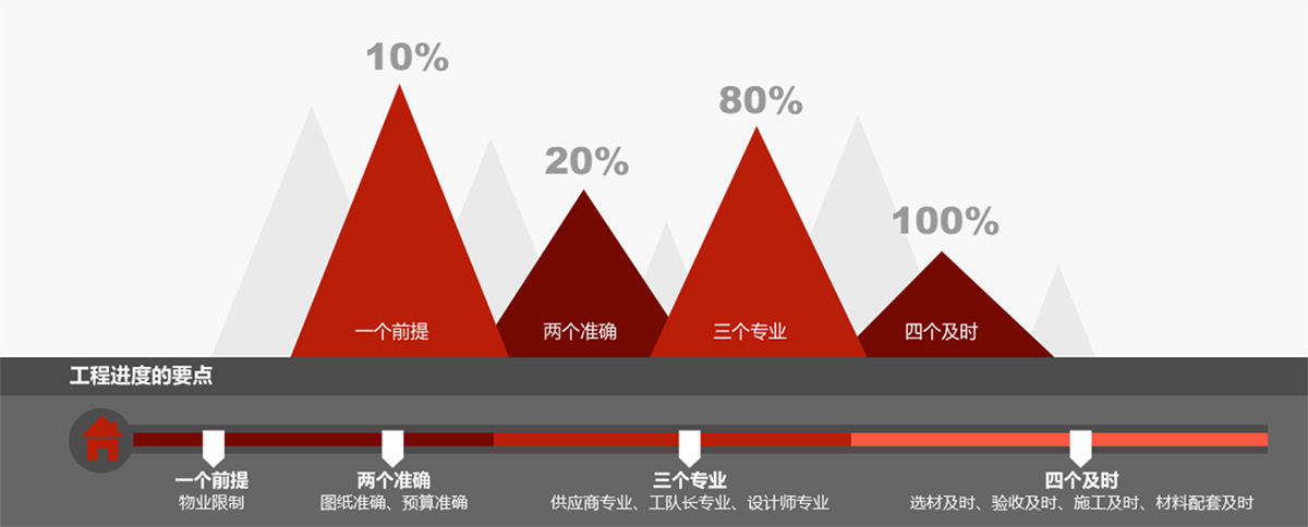 “四個(gè)及時(shí)”中,最容易被忽略的兩點(diǎn)是選材與驗(yàn)收。我們認(rèn)為要把工地井井有條的按計(jì)劃執(zhí)行客戶應(yīng)該在“選材及時(shí)”中給我們以配合。這個(gè)要求,可能覺(jué)得大多數(shù)的裝修公司是不會(huì)跟客戶說(shuō)的,可能出于為了簽單方便的原因,也可能出于內(nèi)部管理松散。舉例來(lái)說(shuō)明,泥工進(jìn)場(chǎng)時(shí),若地面